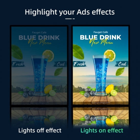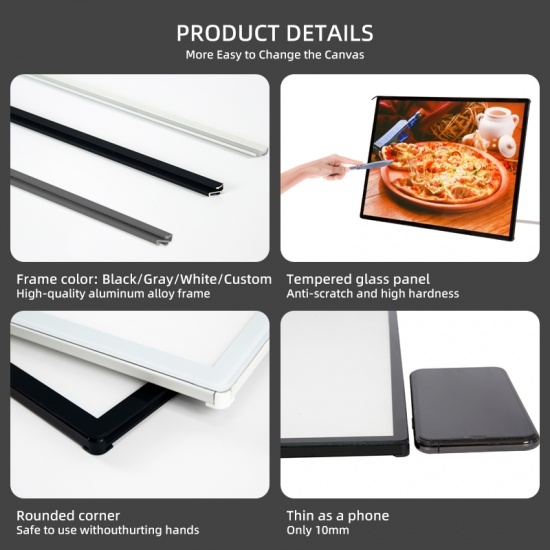Citylux ultra slim light box is manufactured with acrylic light guide panel, high-quality aluminum alloy frame, SMD4014 led strips and 2mm tempered glass on top. Sidelit Design with Uniform Illumination: The Prime Choice for Menu Board Signage. It is very convenient to change the posters.