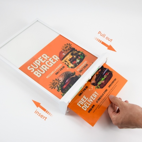 Edge-lit LED slim light box poster frame for advertising! Shine a little light on your promotion with the edge-lit led slim light box poster frame. Hang the poster frame easily on the wall and 'slide' the poster easily in an out when needed. Thanks to the LED acrylic panel your promotion will always catch the attention, even in the dark! Due to the LED acrylic panel your promotion will always catch the attention, even in the dark!